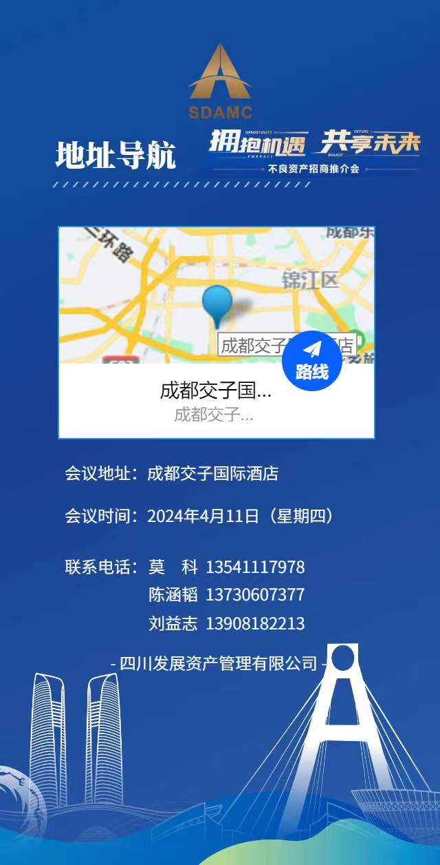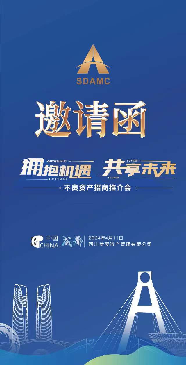 4月11日,四川發(fā)展資產(chǎn)管理有限公司將在成都高新區(qū)交子國際酒店舉辦“2024年不良資產(chǎn)招商推介會”,誠邀您的參與。
