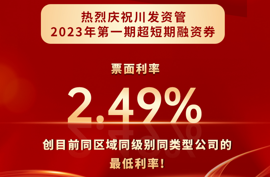 2023年7月24日,四川發(fā)展資產(chǎn)管理有限公司2023年第一期超短期融資券在北金所成功發(fā)行,發(fā)行規(guī)模3億元,期限180天,由興業(yè)銀行承銷。本期債券發(fā)行獲大量投資者關(guān)注,全場認購倍數(shù)達2倍,最終取得2.49%的票面利率,為目前同區(qū)域同級別同類型公司的最低利率。